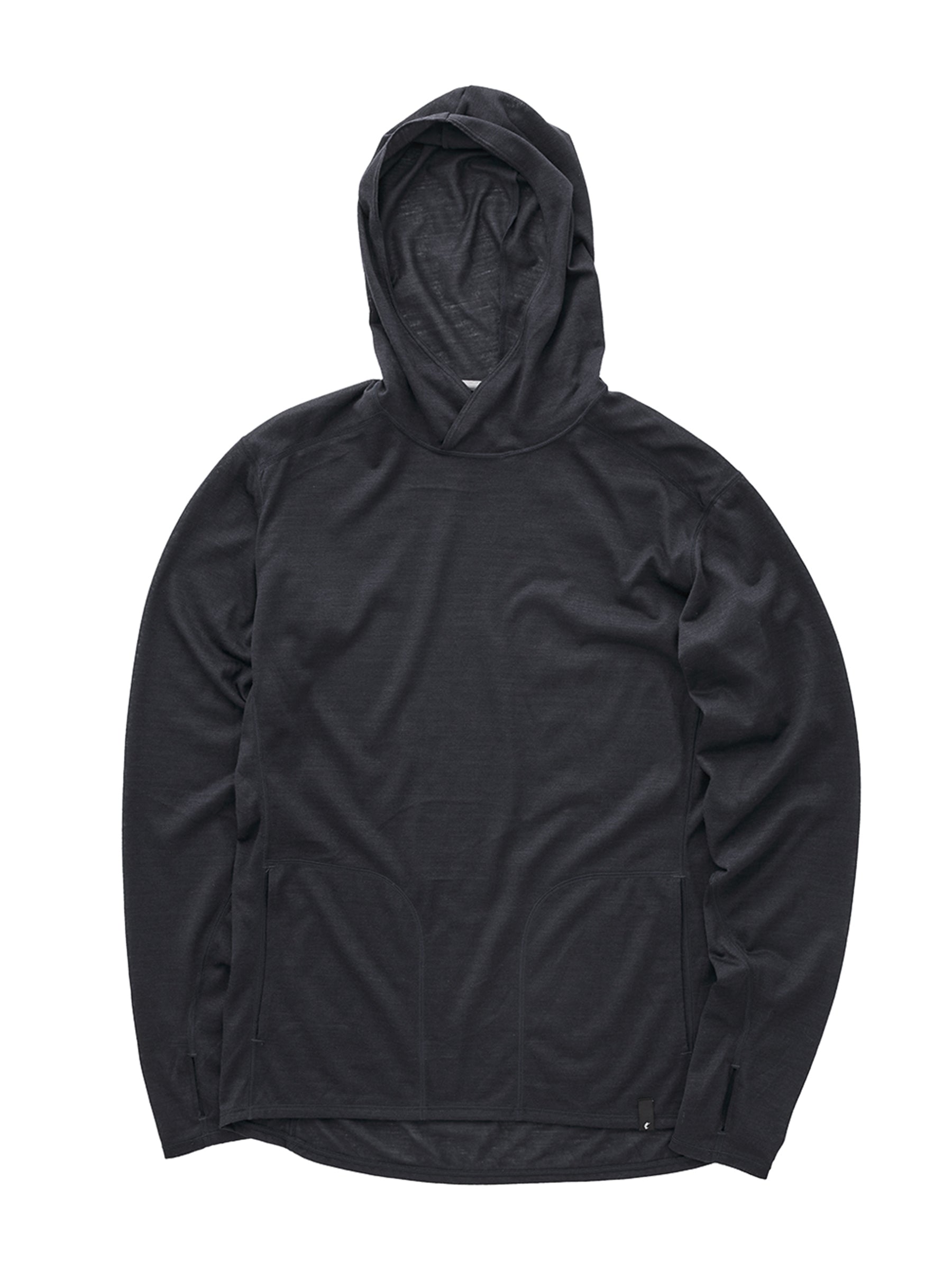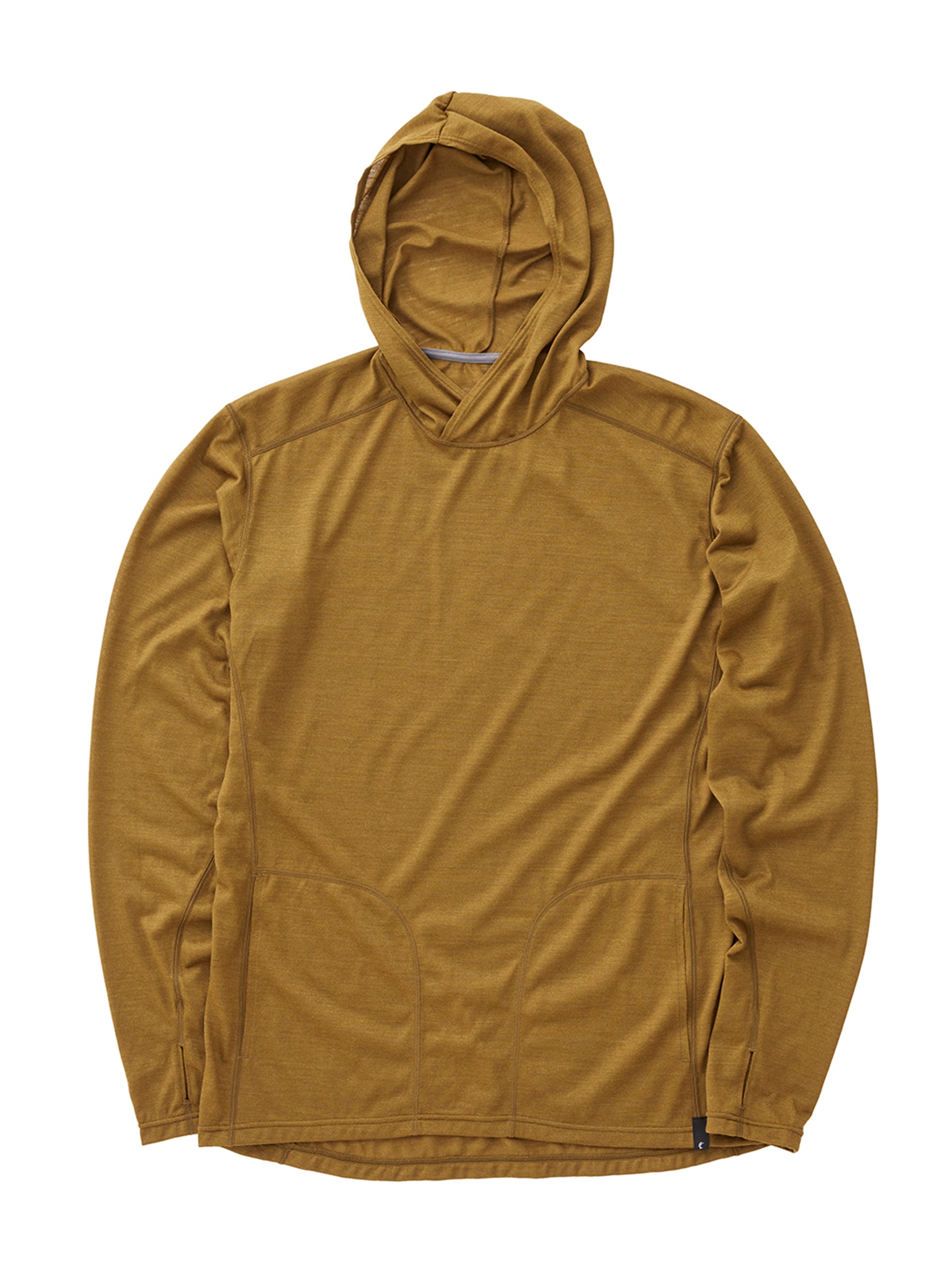 Teton Bros.オリジナルの「Axio」は、ウールと異型断面ポリエステル糸のハイブリッド。吸湿性や防臭効果などのウールのメリットはそのままに、ポリエステルが持つ速乾性や耐久性のような高機能を最大限に引き出しています。「Axio Lite」は、この「Axio」とポリエステルをボーダー状に交互に編んだ生地で、吸汗速乾性がさらに向上しています。フーディは単体でも着やすいリラックスフィット。両サイドにはポケットも備えています。